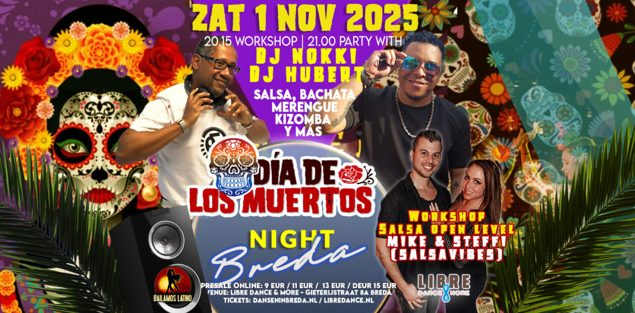 Op ZATERDAG 1 NOVEMBER vieren we DIA DE LOS MUERTOS in de avond bij de LATIN CLUB LIBRE Dance and more in BREDA met de heerlijkste Salsa en Bachata beats & more!